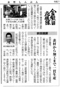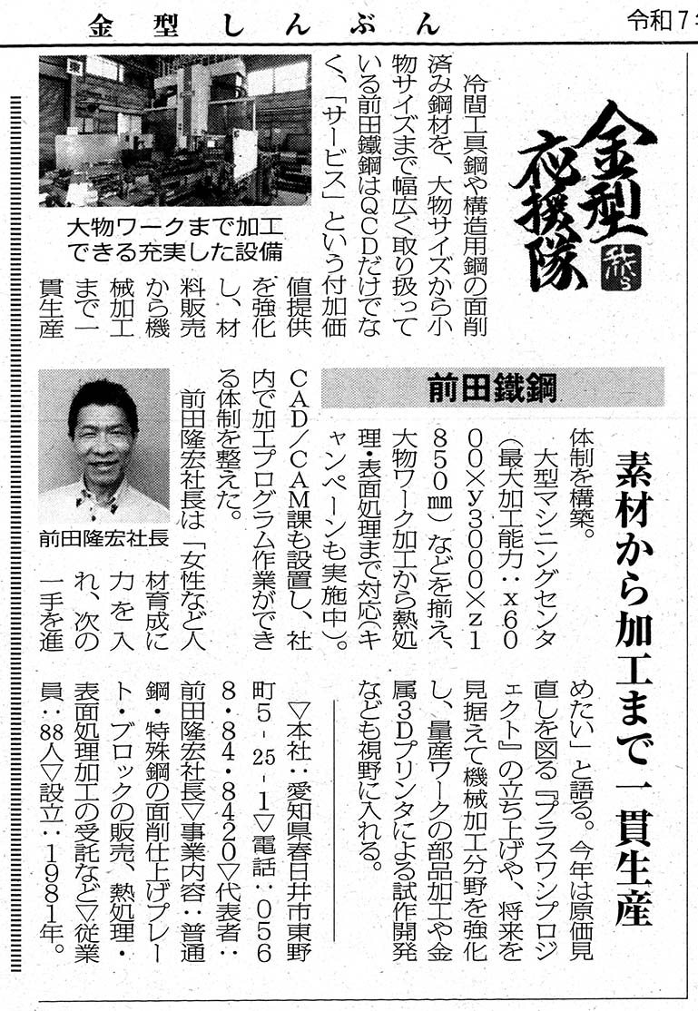 2025.09.30 お知らせ 金型しんぶんに掲載されました 2025年9月10日発行の「金型しんぶん」に当社の紹介記事が掲載されました。 記事中にも記載いただいた通り、 現在【鋼材+熱処理+表面処理】を同時注文いただいた場合、 特別価格にてご提供させていただくキャンペーンを実施中です。 ぜひお気軽にお問合せください。